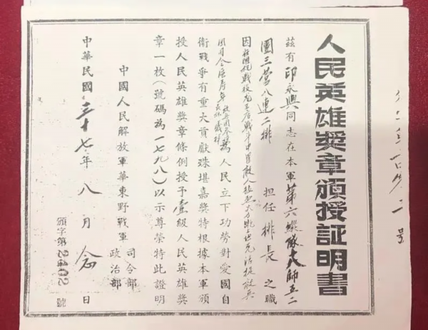 市档案馆馆藏的印永鑫华东野战军一级人民英雄证书;