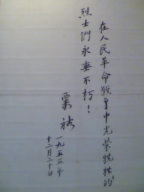 “在人民革命战争中光荣牺牲的烈士们永垂不朽!”是粟裕为泰兴市杨村庙烈士堂所题。