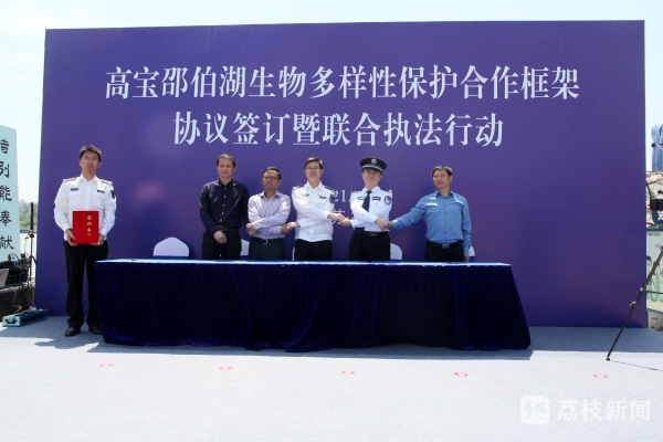 5月22日是生物多样性国际日。为切实保护湖区生物多样性,今天上午,江苏省高宝邵伯湖渔管办会同扬州市公安局等多部门在高邮湖渔政码头共同签订生物多样性保护合作框架协议签署,共同开展常态化执法。
