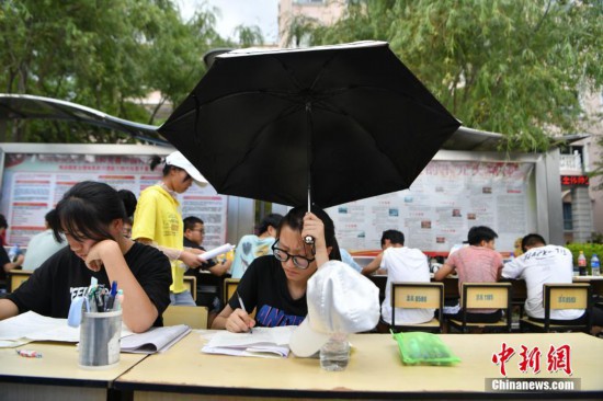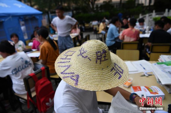 5月22日,云南省大理州漾濞县漾濞一中的高三学生在露天“教室”备战高考。5月21日,当地连发多次地震,最高6.4级。图为一名高三男生戴着草帽复习。 中新社记者 刘冉阳 摄