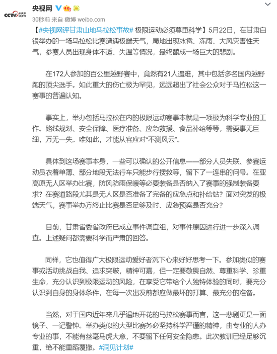 5月22日,在甘肃白银举办的一场马拉松比赛遭遇极端天气,局地出现冰雹、冻雨、大风灾害性天气,参赛人员出现身体不适、失温等情况,最终酿成一场巨大的悲剧。