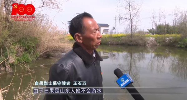 白果牺牲的那天是1941年,农历七月初二,日本鬼子从四个方向围剿过来。当时白果闻讯以后,组织民兵反抗,结果是寡不敌众,当时准备跳出包围圈的,就是从我们这里跳下河的,由于白果是山东人,他不会游水,下河后直往下沉,然后就牺牲了。