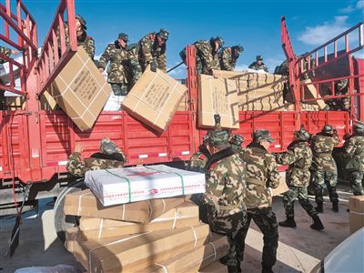 5月22日,武警青海总队果洛支队官兵在玛多县政府广场卸载救援物资。单林威摄