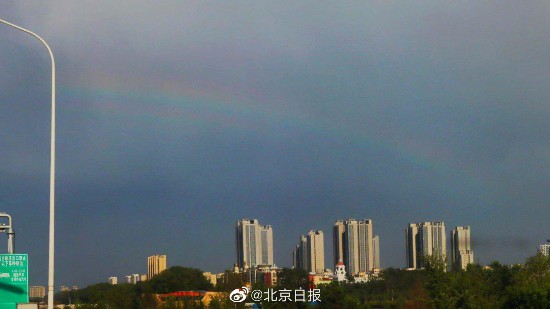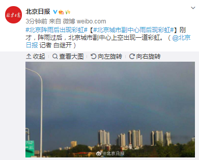 刚才,阵雨过后,北京城市副中心上空出现一道彩虹。