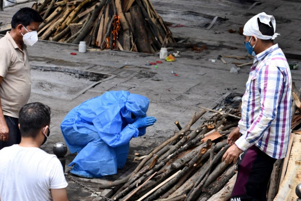 5月21日,在印度新德里一家火葬场,一名身着防护服的亲属在火化前哀悼亲人。(新华社发,帕塔·萨卡尔摄)