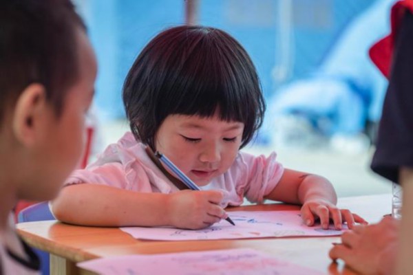 5月23日在云南省漾濞县人和广场安置点孩子们在画画 新华社记者胡超 摄