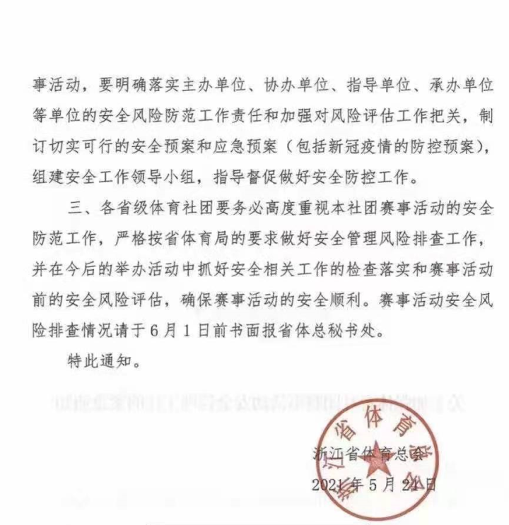 此外,通知还规定了各项赛事活动安全风险排查的期限,所有相关情况均需在6月1日前书面报省体总秘书处。