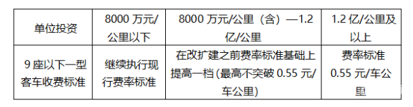 “十四五”期间,江苏省规划改扩建高速公路里程770公里以上,改扩建日益成为江苏省高速公路建设发展的常态。鉴于高速公路改扩建工程征地拆迁费用、人工成本、建筑材料等成本持续攀升,改扩建投资持续增加,统筹考虑促进江苏省高速公路事业长远发展和降低实体经济企业成本等因素,拟根据高速公路改扩建项目单位投资对改扩建工程收费政策作进一步完善,以9座以下一型客车为例,改扩建单位投资8000万元/公里以下的继续执行现行费率标准;8000万元/公里(含)至1.2亿元/公里的费率标准在改扩建之前的费率标准基础上提高一档,最高不突破0.55元/车公里;1.2亿元/公里及以上的费率标准为0.55元/车公里。详见下表: