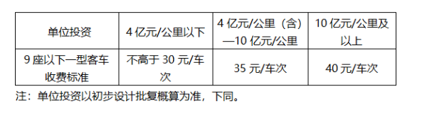 “十四五”期间,江苏规划新建龙潭、常泰、张皋等多座跨江大桥。鉴于五峰山过江通道(跨江大桥)以及规划新建的跨江大桥技术等级高、概算投资大、后期运维费用高,单位投资持续增加,统筹考虑过江通道建设需求和降低实体经济企业成本等因素,拟对江苏省跨江大桥车辆通行费定价机制作进一步完善,以9座以下一型客车为例,单位投资4亿元/公里以下的收费标准不高于30元/车次,4亿元/公里(含)至10亿元/公里的收费标准为35元/车次,10亿元/公里及以上的收费标准为40元/车次。详见下表:
