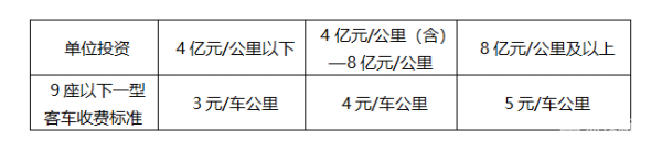 按照江苏省现行高速公路车辆通行费客车收费标准,以9座以下一型客车为例,共分为三类:单位投资6000万元以下的执行0.45元/车公里费率标准,单位投资6000万元至8000万元的执行0.5元/车公里费率标准,单位投资8000万元以上的执行0.55元/车公里费率标准。