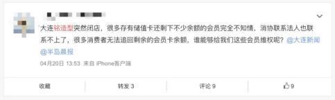 健康时报记者通过了解到,“铭造型”在大连有四个分店,约在两个月前左右陷入破产风波而闭店。微博上,有当地多位网友投诉该店突然倒闭,很多店里的会员都不知情,无法追回会员卡的余额。为此,还有该店的会员自发建立了维权群。