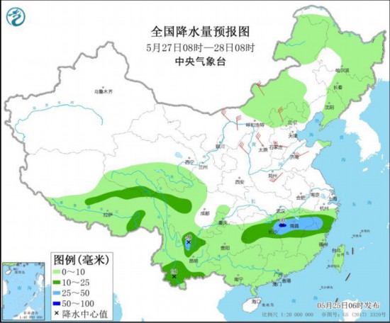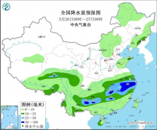全国降水量预报图(5月25日08时-26日08时) 图片来源:中央气象台网站