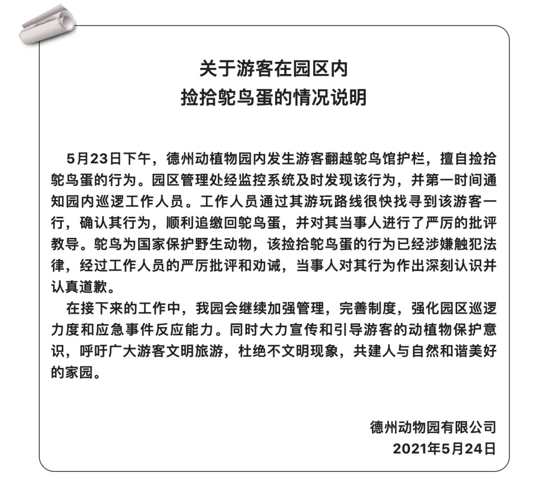 园方通报:已顺利追回鸵鸟蛋