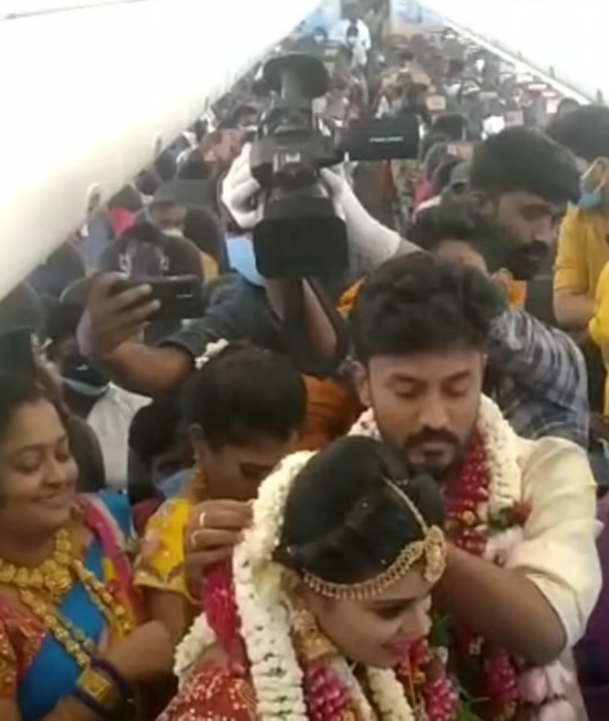 据《每日邮报》24日消息称,泰米尔纳德邦目前正处于封锁限制之下,规定婚礼人数不能超过50人。因此这对夫妇选择在飞机上完成婚礼,以便邀请160余位亲朋好友参加。拉凯什和达希娜在印度香料航空公司预定了一架从泰米尔纳德邦马杜赖市起飞的包机。婚礼现场的视频和照片随即被上传到社交媒体上,飞机上几乎无人佩戴口罩,场面一片混乱,人们向镜头展示脖子上戴的鲜花并拍照留念。