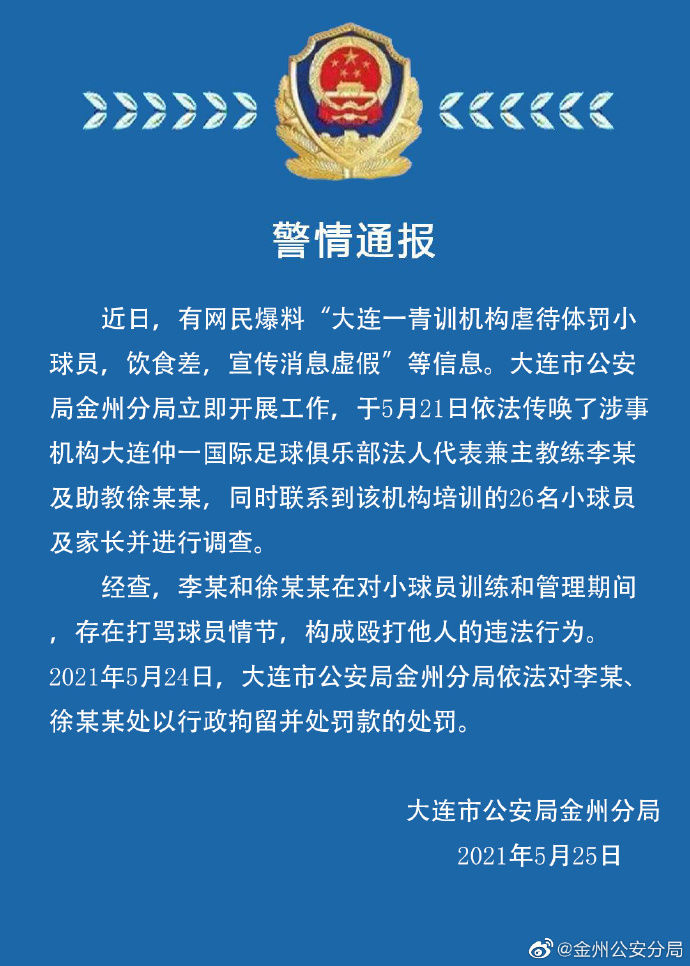25日,大连市公安局金州分局官方微博@金州公安分局官方表示:大连市公安局金州分局立即开展工作,于5月21日依法传唤了涉事机构大连仲一国际足球俱乐部法人代表兼主教练李某及助教徐某某,同时联系到该机构培训的26名小球员及家长并进行调查。