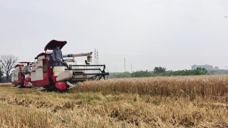 在位于常福街道虞美润农业专业合作社的麦田里,四台收割机正在快速收割小麦。合作社负责人介绍,这片田种植的是早熟品种“扬麦23号”。