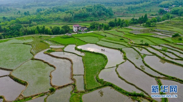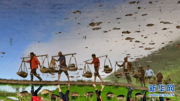 5月22日,水倒影中,安徽省旌德县白地镇汪村岭下组农民行走在田间。
