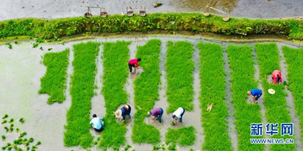 5月22日,旌德县白地镇汪村岭下组村民正在手工插秧。