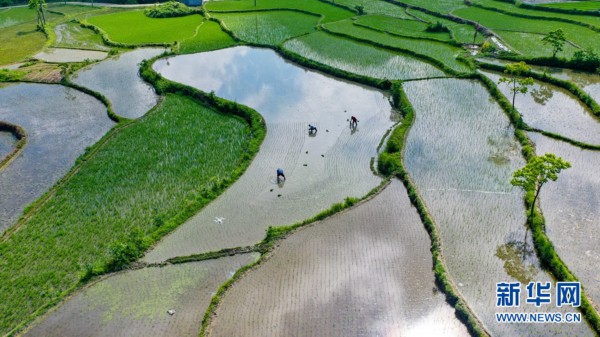 5月22日,旌德县白地镇汪村岭下组村民们正在梯田里插秧。