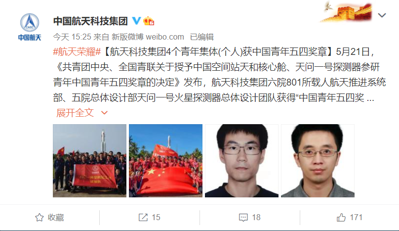 荔枝新闻讯 @中国航天科技集团5月25日消息,5月21日,《共青团中央、全国青联关于授予中国空间站天和核心舱、天问一号探测器参研青年中国青年五四奖章的决定》发布,航天科技集团六院801所载人航天推进系统部、五院总体设计部天问一号火星探测器总体设计团队获得“中国青年五四奖章集体”称号,一院一部副主任设计师冯韶伟、八院509所火星环绕器总体主任设计师牛俊坡获得“中国青年五四奖章”称号。