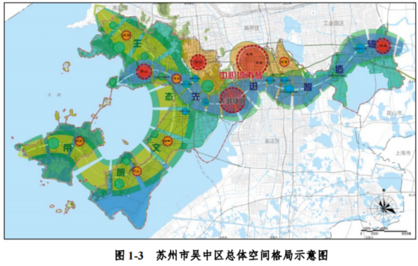 五区组团:阳澄生态新区(高铁新城)片区、漕湖国家级经济技术开发区片区、黄埭高新区片区、元和高新区片区、阳澄湖生态旅游度假区片区。
