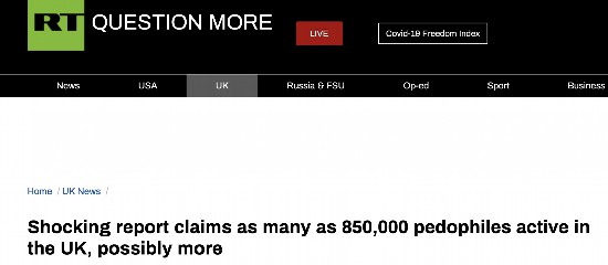 RT称,如果数字在85万的话,相当于每77个英国人中就有一人对儿童构成性威胁。报告中提到,这个数字不包括非英国公民以及未成年人。RT称,这意味着实际数字可能会更高。