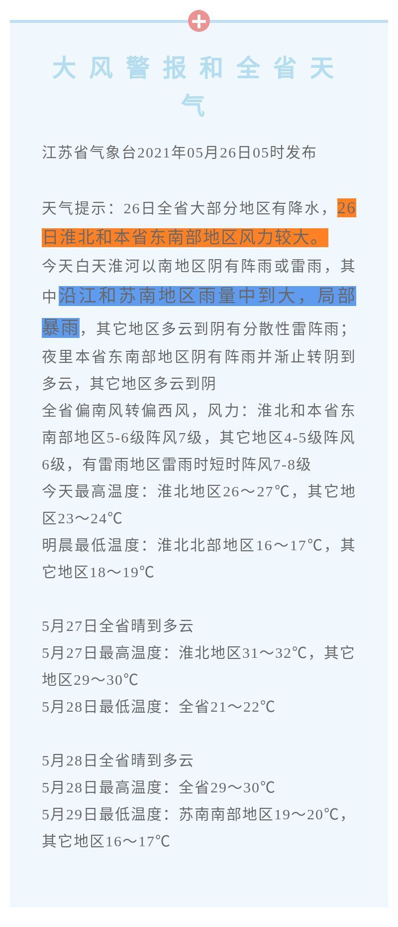 今天白天淮河以南地区阴有阵雨或雷雨,其中沿江和苏南地区雨量中到大,局部暴雨,其它地区多云到阴有分散性雷阵雨;夜里本省东南部地区阴有阵雨并渐止转阴到多云,其它地区多云到阴,全省偏南风转偏西风,风力:淮北和本省东南部地区5-6级阵风7级,其它地区4-5级阵风6级,有雷雨地区雷雨时短时阵风7-8级,今天最高温度:淮北地区26~27℃,其它地区23~24℃,明晨最低温度:淮北北部地区16~17℃,其它地区18~19℃。