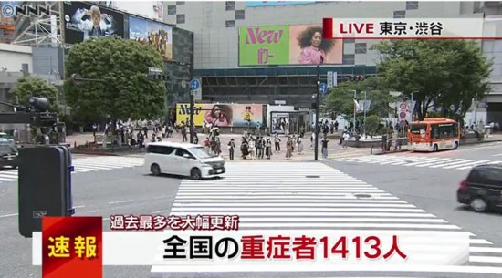 日本国内现有重症病例1413例,再次刷新历史最高纪录。(日本电视台视频截图)