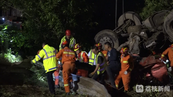 5月24日晚9点,沈海高速盐城射阳境内,一辆冷藏车撞毁路边的隔离护栏后,侧翻到高速公路边的排水沟渠里,两名驾乘人员被困驾驶室内无法动弹。当地消防赶到现场时,清障部门已经用起重吊车将车辆的车头部位吊起,为消防员营救被困人员腾出空间。经过三个半小时的救援,车内二人被成功救出,抬上等候已久的120救护车送往医院抢救。