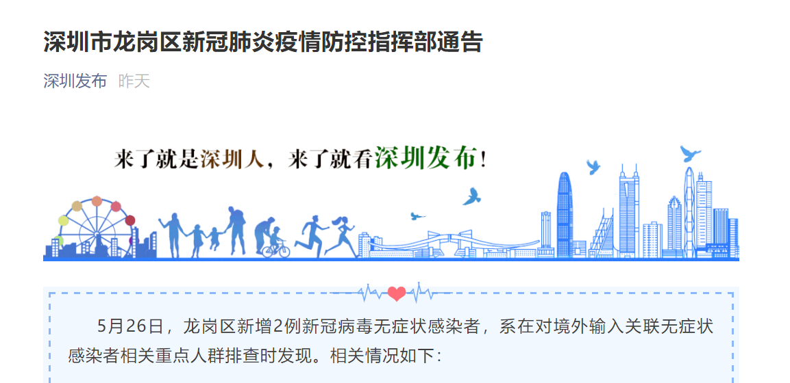5月26日,龙岗区新增2例新冠病毒无症状感染者,系在对境外输入关联无症状感染者相关重点人群排查时发现。相关情况如下: