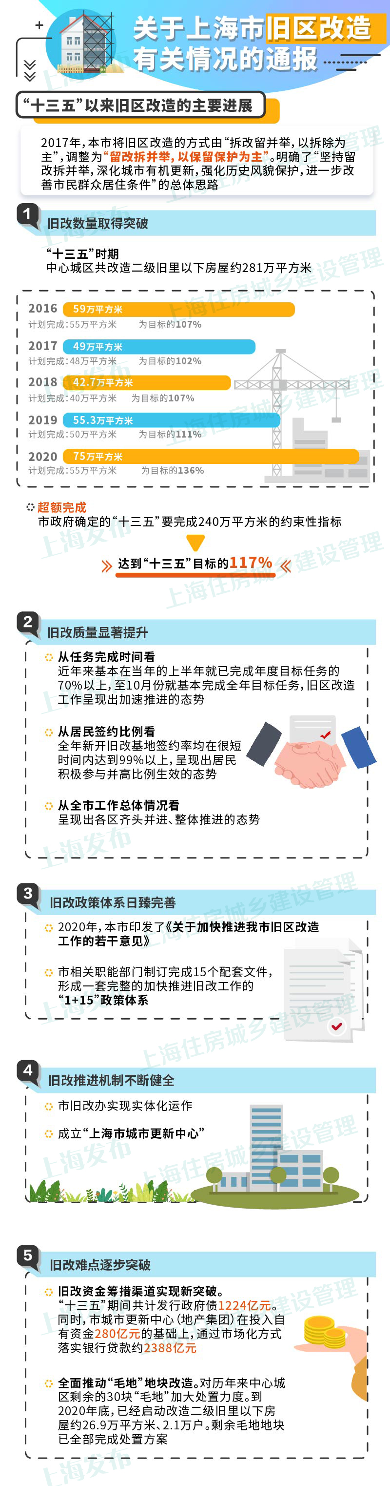 “十三五”时期,中心城区共改造二级旧里以下房屋约281万平方米,超额完成原定240万平方米的约束性指标,为目标的117%(其中:2016年计划完成55万平方米,实际完成59万平方米,为目标的107%;2017年计划完成48万平方米,实际完成49万平方米,为目标的102%;2018年计划完成40万平方米,实际完成42.7万平方米,为目标的107%;2019年计划完成50万平方米,实际完成55.3万平方米,为目标的111%;2020年计划完成55万平方米,实际完成75万平方米,为目标的136%);