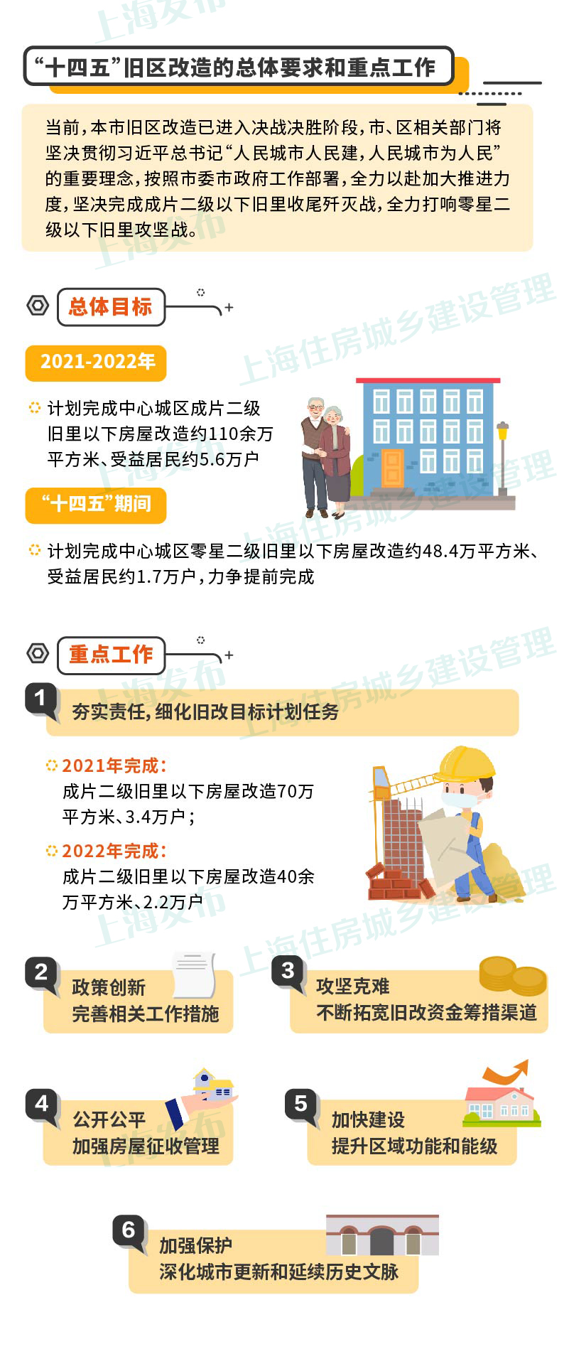 6.加强保护,深化城市更新和延续历史文脉。一是深化城市更新,拓展旧区改造工作内涵。根据住建部“实施城市更新行动”相关要求,结合《上海市城市更新条例》立法,在确保成片旧改任务全面完成的基础上,坚持“留改拆并举,以保留保护为主”,以点带面,总结推广。