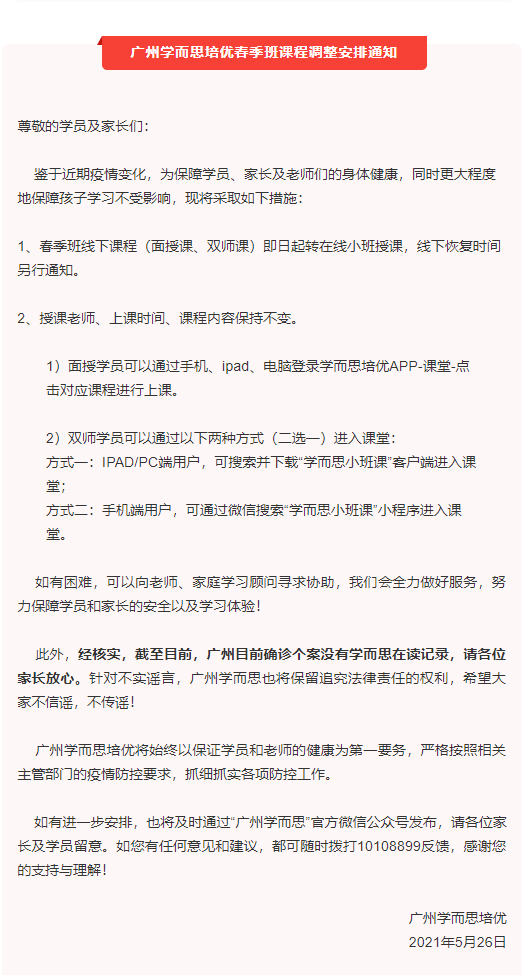 荔枝新闻讯 5月26日,广州市荔湾区新型冠状病毒肺炎疫情防控指挥部通报,广州新增2例确诊,1例无症状感染者,其中一确诊病例为五年级小学生,随后网传该小学生为学而思学员,周末曾在广州学而思某校区上培训班。“广州学而思”微信公众号5月26日发布春季班课程调整安排通知,此外辟谣称,经核实,截至目前,广州目前确诊个案没有学而思在读记录,请各位家长放心。