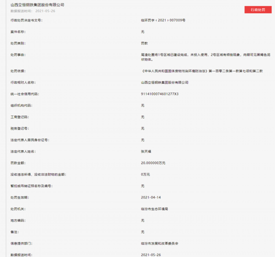 中国网财经5月27日讯 信用中国(山西)网站5月26日公示的一则行政处罚信息显示,近日,山西立恒钢铁集团股份有限公司因“尾渣处置场1号区域已建设完成,未投入使用,2号区域有倾倒现象,肉眼可见黑褐色泥状物体”,被临汾市生态环境局依据《中华人民共和国固体废物污染环境防治法》(以下简称《固废污染防治法》)第一百零二条第一款第七项和第二款罚款20万元。