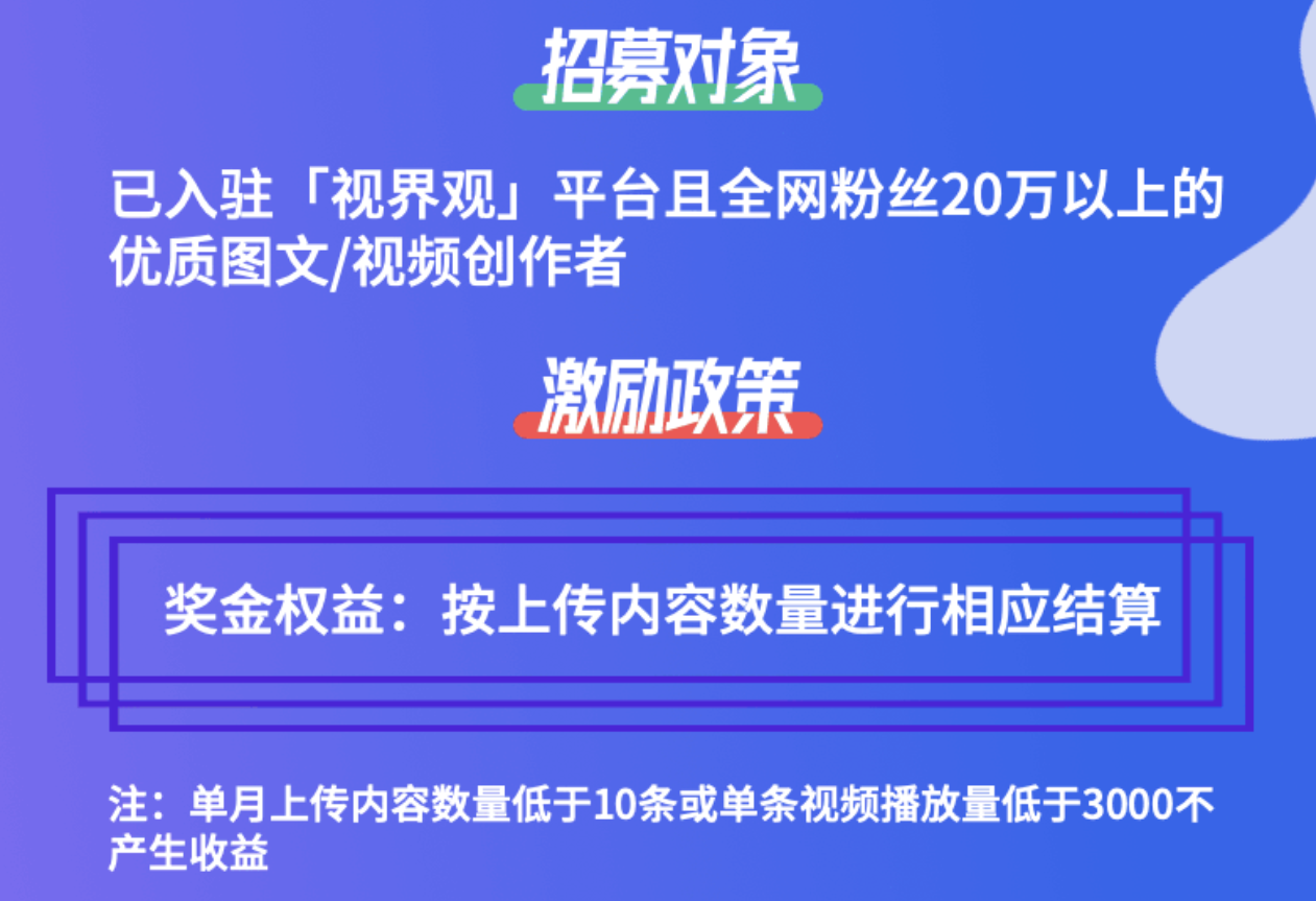 “繁星计划”4.0版本将于2021年6月1日正式开启!“繁星计划”是视界观APP面向各领域优质原创视频作者打造的长期激励计划,这一次我们的内容赛道除了保留原有的知识、资讯、文旅、生活和影视之外,又拓展了宠物和亲子垂直赛道,推出更全面的赋能计划,旨在孵化现象级的视界IP,同样我们将持续布局垂类赛道、打造品质内容生态,希望更多的优质创作者加入。