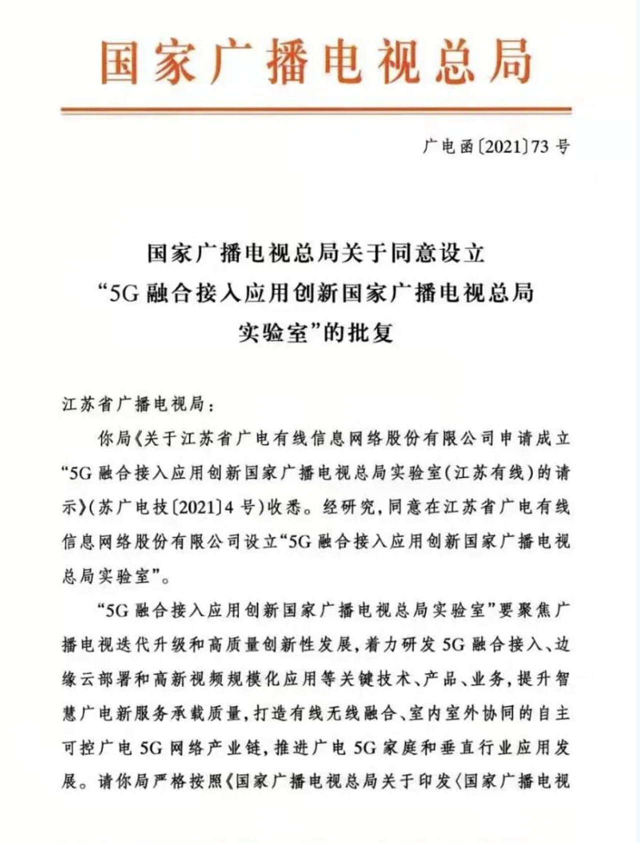 5月28日,在第二十八届中国国际广播电视信息网络展览会(简称CCBN)的国家广电总局实验室专题论坛上,国家广电总局科技司宣布了新一批总局实验室批复成立名单,由江苏有线作为依托单位申报的“5G融合接入应用创新国家广电总局实验室”通过考察审核,获得正式批复成立。该实验室是全国广电系统首个5G网络领域的实验室,也是江苏有线获批的第二个总局实验室。
