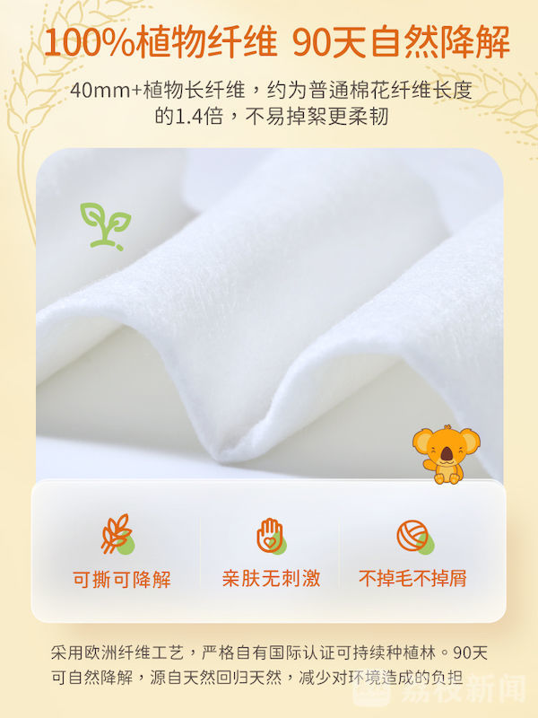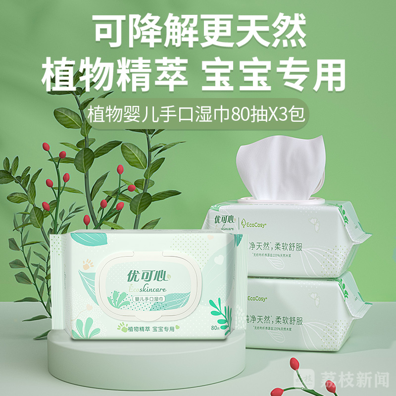 严选八层净化EDI纯水,100%植物纤维的优可心湿巾使用后90天可完全自然降解,纯绿色天然,对环境无污染。
