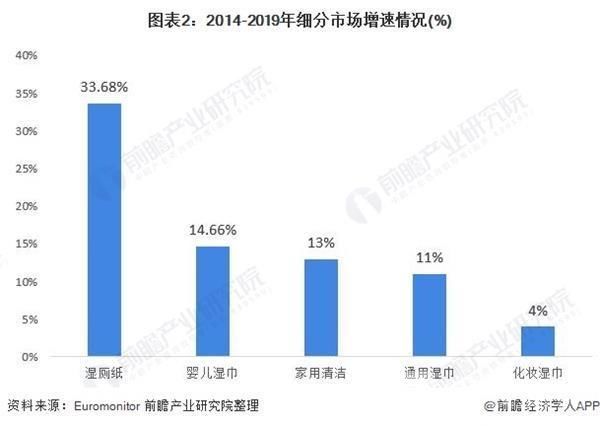 根据前瞻产业研究院整理,市场上湿巾一般分为儿童湿巾、家用清洁、化妆湿巾、通用湿巾、湿厕纸和女性护理湿巾。2019年,儿童湿巾占据着我国湿巾的主要市场份额,占比超过一半。同时,婴儿湿巾近年来发展增速较快,接近15%。