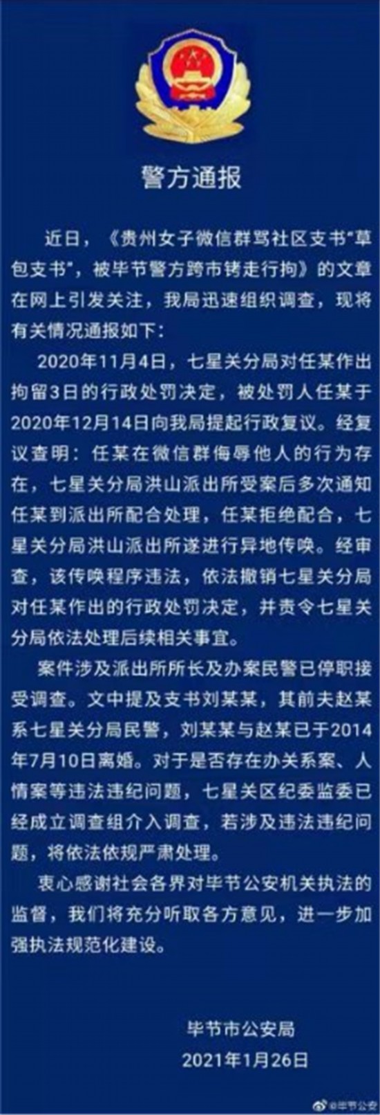 1月25日,猛犸新闻·东方今报 以《贵州女子微信群骂社区支书“草包支书”,被毕节警方跨市铐走行拘》为题独家予以披露,该新闻也迅速登上热搜。1月26日,毕节市公安局对外通报称,经复议查明:任某在微信群侮辱他人的行为存在,七星关分局洪山路派出所受案后多次通知任某到派出所配合处理,任某拒绝配合,七星关分局红山路派出所遂进行异地传唤。经审查,该传唤程序违法,依法撤销七星关分局对任某做出的行政处罚决定,并责令七星关分局依法处理后续相关事宜。案件涉及派出所所长及办案民警已停职接受调查。文中提及支书刘某某,其前夫赵某系七星关分局民警,刘某某与赵某已于2014年7月10日离婚。对于是否存在办关系案、人情案等违法违纪问题,七星关区纪委监委已经成立调查组介入调查,若涉及违法违纪问题,将依法依规严肃处理。