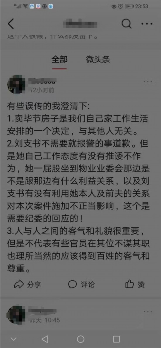 在28日中午,任女士在某网络平台所发的“有些误传我澄清下”中曾提到,“刘支书不需要就报警的事道歉,但是她自己工作态度有没有推诿不作为,她一屁股坐到物业、业委会那边是不是跟那边有什么利益关系,以及刘支书有没有利用她本人及前夫的关系对本次案件施加不正当影响,这个是需要纪委的回应的!”