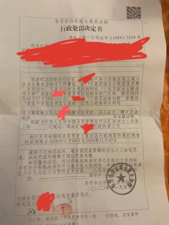 2020年1月22日,贵州省贵阳市的任女士向猛犸新闻 猛犸新闻·东方今报记者反映,她在毕节市兰苑花园小区居住时,因在该小区业主群质疑业委会不召开业主大会便擅自让新物业公司通过试用期的行为时,不满社区支书刘某的“开不开业主大会,怎么开是业委会的事”的回应,就将该回应截屏发到业主们的一个维权群里,并在下面跟了一句“看这个草包支书是怎么说的”。就因为这句话,刘某向毕节市公安局七星关分局洪山路派出所报了警。而洪山路派出所民警为此专程赶到贵阳市将任女士用手铐铐回毕节市,并将其行拘3日。在此过程中,警方存在着违法传唤、违法使用手铐、虐待等问题。