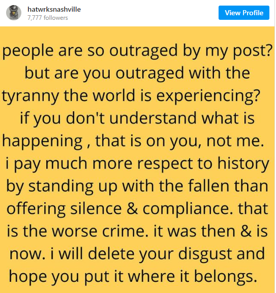当天晚些时候,这家商店在 Instagram上回应批评,“人们对我的帖子感到非常愤怒……但你们对这个世界正在经历的‘暴政’感到愤怒吗?” RT解释称,该言论可能指的是政府在疫情大流行期间实施的限制措施。
