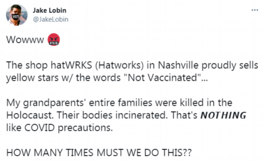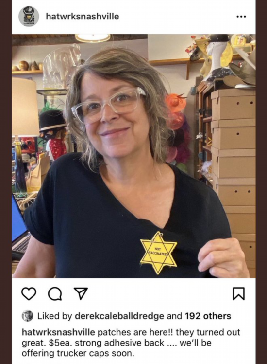 一位愤怒的网友表示,“纳什维尔的HATWRKS商店自豪地出售印有‘未接种疫苗’字样的黄色星星……我祖父母全家都在大屠杀中丧生。他们的身体被焚烧了。这与新冠预防措施一点也不像。”↓