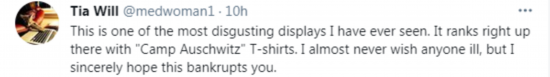 也有网友表示,“这是我见过的最恶心的展示之一。它与‘奥斯威辛集中营’T恤并驾齐驱。我几乎从不希望任何人遭殃,但我真心希望这会让你破产。”