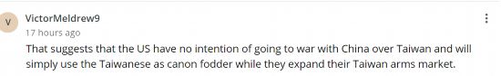 “这表明,美国无意就台湾问题与中国(大陆)开战,而只是在扩大台湾武器市场时,把台湾人当炮灰。”