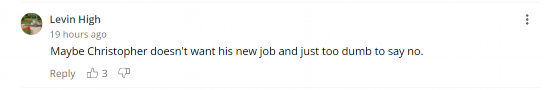 更有人直接讽刺他:“也许克里斯托弗是不想要他的新工作,又蠢到不肯说不。”↓
