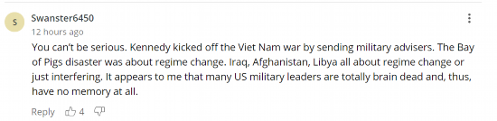 “你不是认真的吧?肯尼迪派遣了军事顾问,从而引发越南战争。‘猪湾事件’是关于政权更迭的。伊拉克,阿富汗,利比亚都是关于政权更迭或干涉。在我看来,许多美国军事领导人已完全脑死亡,因此完全没记忆了。”
