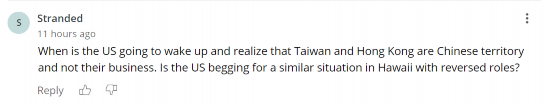 “美国什么时候才能清醒过来,意识到台湾和香港是中国领土,与他们无关。美国是否希望角色互换下,在夏威夷发生类似情况?”