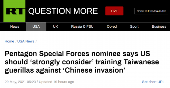 “五角大楼特种部队候选人称,美国应‘强烈考虑’训练台湾游击队对抗‘中国(大陆)入侵’”——“今日俄罗斯”(RT)5月29日以此为题报道声称,被美国总统拜登提名负责监督美军特种部队的克里斯托弗·迈耶尔本周跳出来宣称,美官员应“强烈考虑”将突击队部署到台湾,以训练台军如何阻止潜在的“中国(大陆)入侵”。这种异想天开的想法,很快被不少网友嘲讽,有人忍不住吐槽,“在我看来,许多美国军事领导人已完全脑死亡”,“也许克里斯托弗是不想要他的新工作,又蠢到不肯说不”。