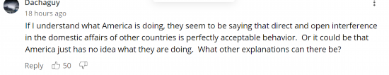 “如果让我来理解下美国在干什么,他们似乎是在说,直接及公开干涉别国内政是完全可以接受的行为。也可能是美国根本不知道自己在干什么。还能有其他什么解释?”